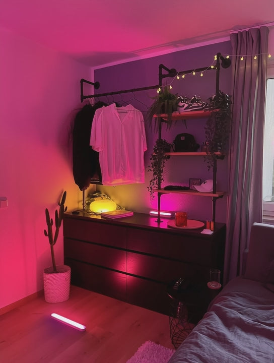 Strak industrieel wandrek opgebouwd uit hoogwaardige stalen buizen en premium eiken hout. Een sterke, moderne oplossing om je kamer direct een upgrade te geven.